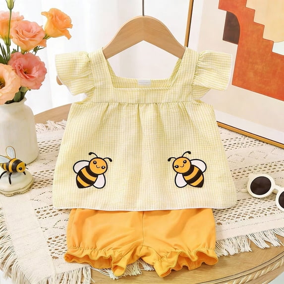 2-Piece Girls Flutter Sleeve Plaid Cartoon Bee Print Tee Ruffled Shorts ...