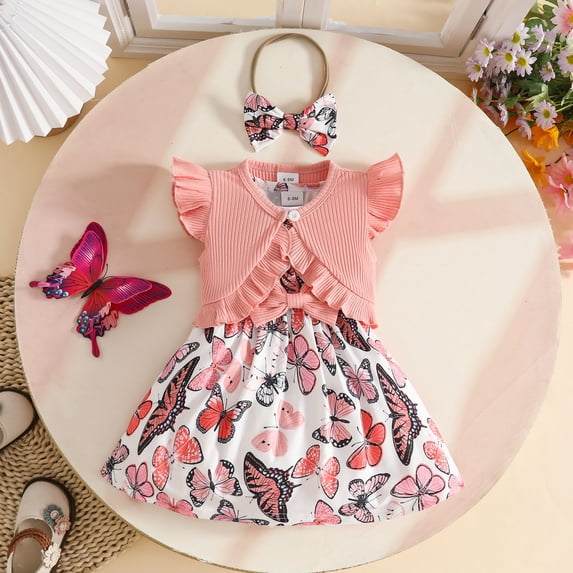 2-Piece Girls Ruffled Flutter Sleeve Short Jacket Butterfly Print Vest ...