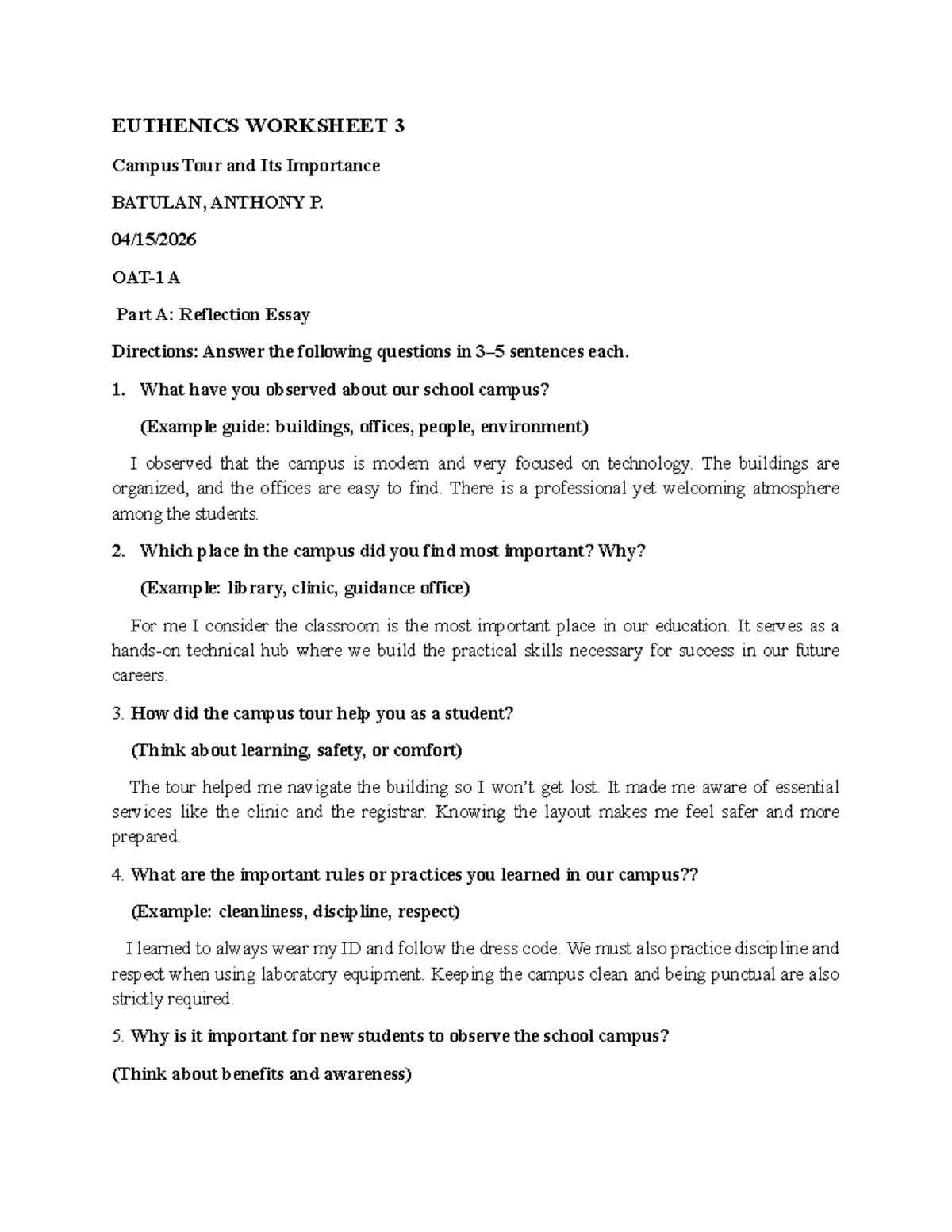 EUTHENICS WORKSHEET 3: Campus Tour Reflection Essay - Studocu