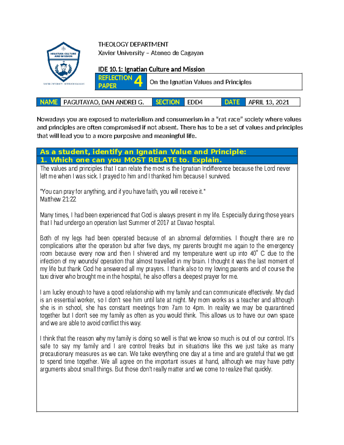 IDE 10.1: Reflection on Ignatian Values and Principles - Studocu