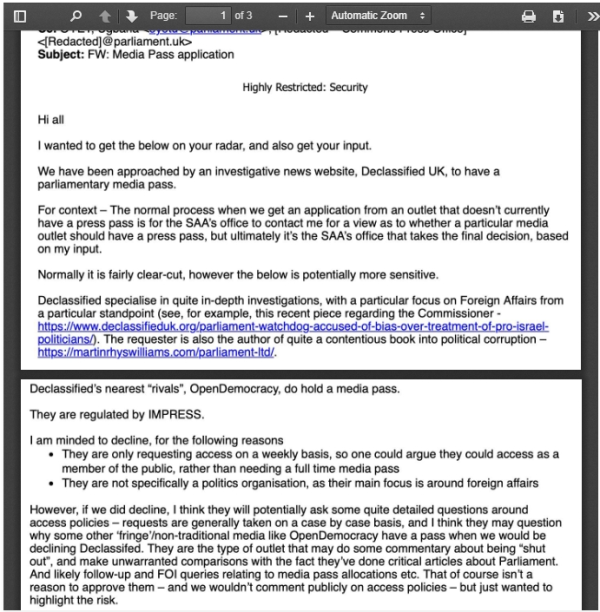 Parliament Blocks Declassified, Citing Our Gaza ‘Standpoint’
