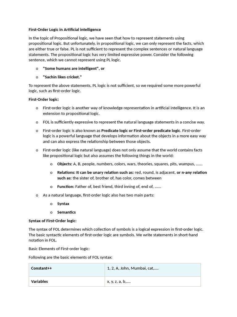 First-Order Logic (FOL) in AI is a powerful form of knowledge ...