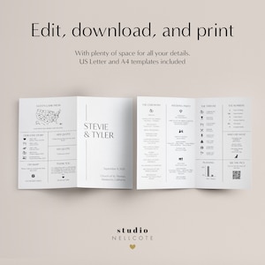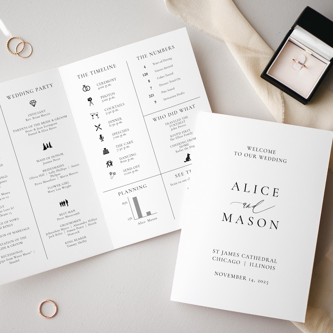 Folded Wedding Program & Timeline Template With Icons, Minimal Wedding ...