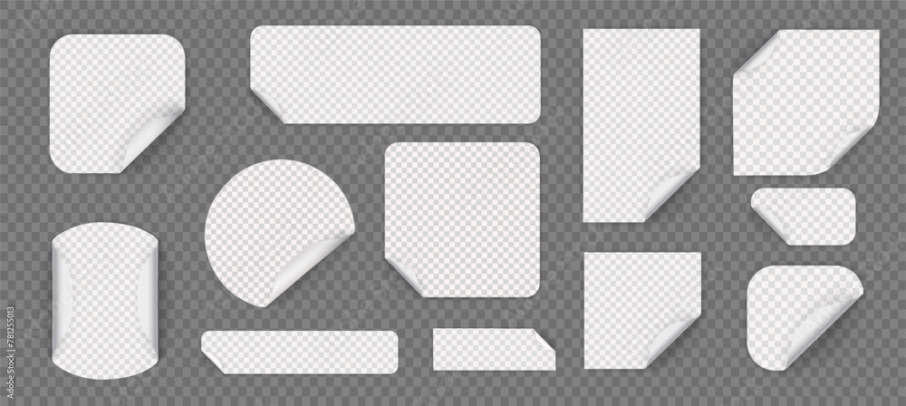 White stickers. Blank adhesive sticker with folded or curled corners ...