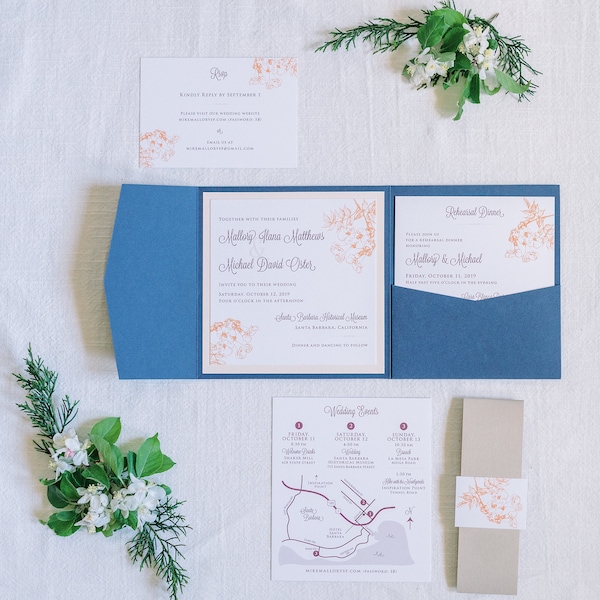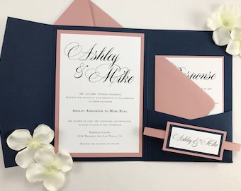 Navy and Dusty Rose pocket folder invites with belly band Navy | Etsy