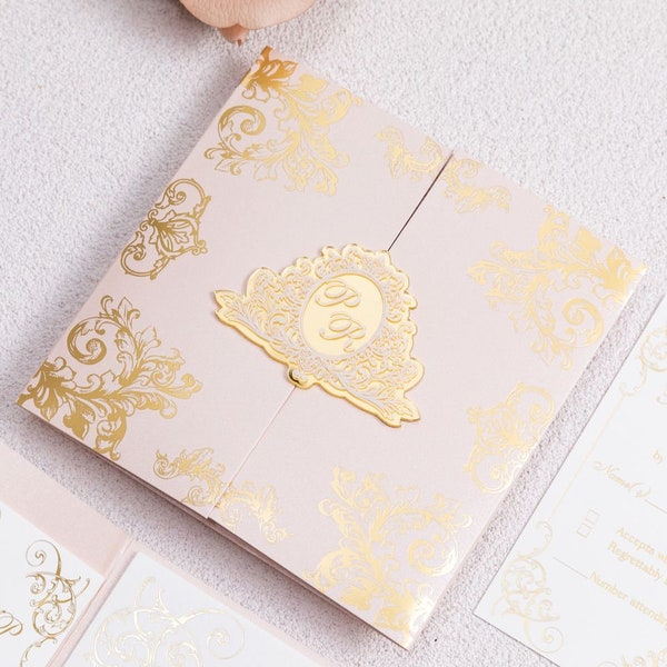Floral Gold Foil Wedding Invites With Dark Grey Pocket Folder, Luxury ...