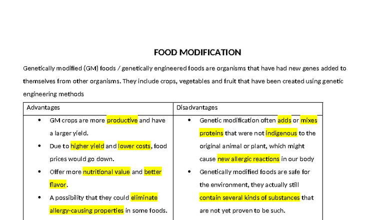 FOOD MODIFICATION: Vocabulary and Insights on GM Foods - Studocu