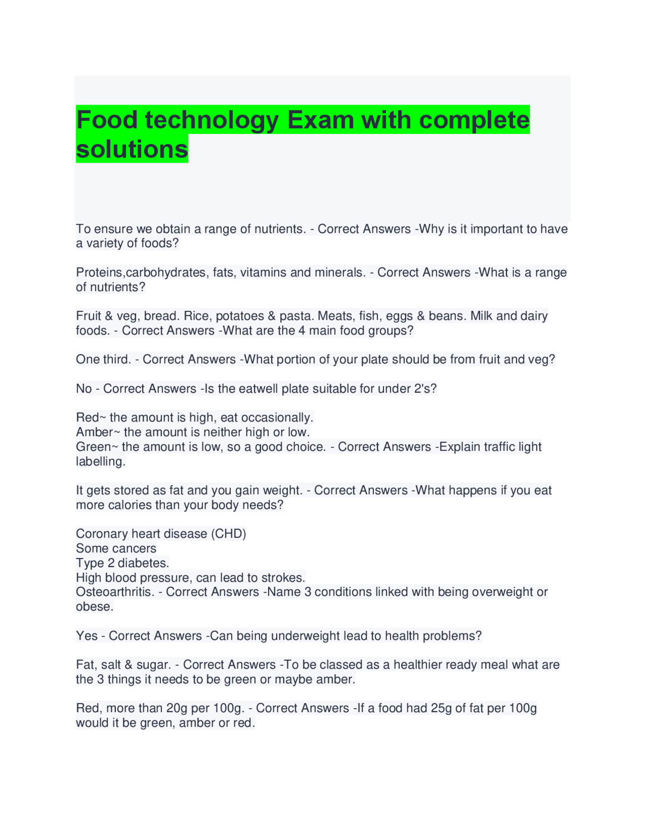 Food Technology Quiz Questions with 100% Correct Answers - Food ...