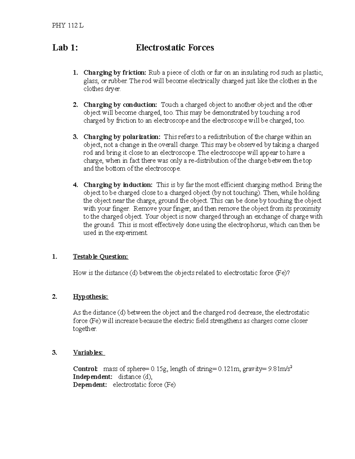 Electrostatic forces lab 1 - Lab 1: Electrostatic Forces 1. Testable ...