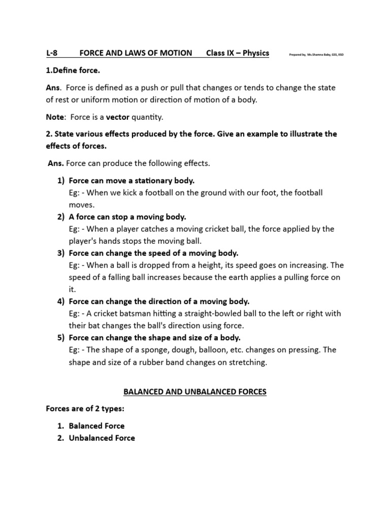 Class 9 - Sci - CH 9 - Force - Notes | PDF | Force | Momentum