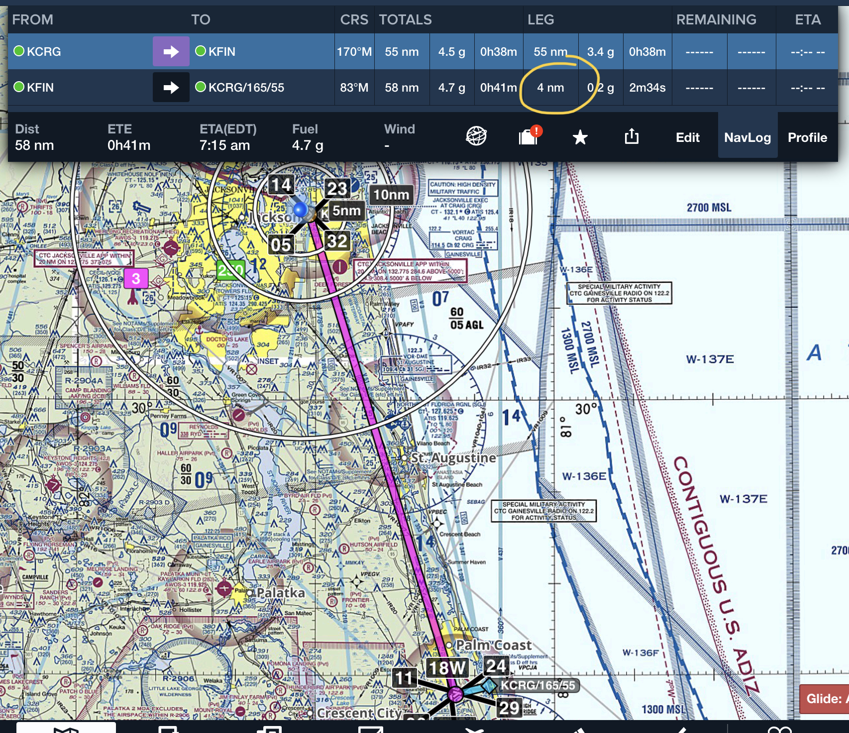 ForeFlight screenshot of route plan from facility 4 to 3 and vertical ...