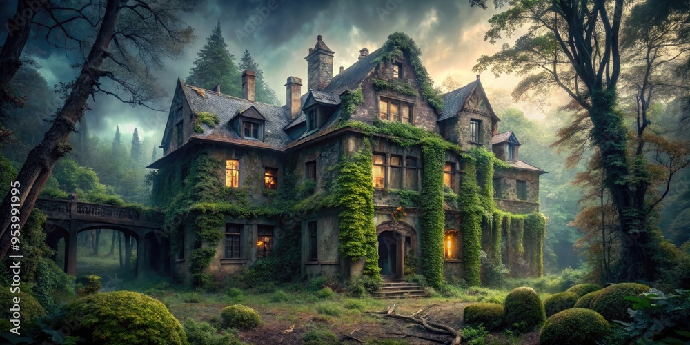 A spooky, abandoned mansion with crumbling stone walls, overgrown with ...
