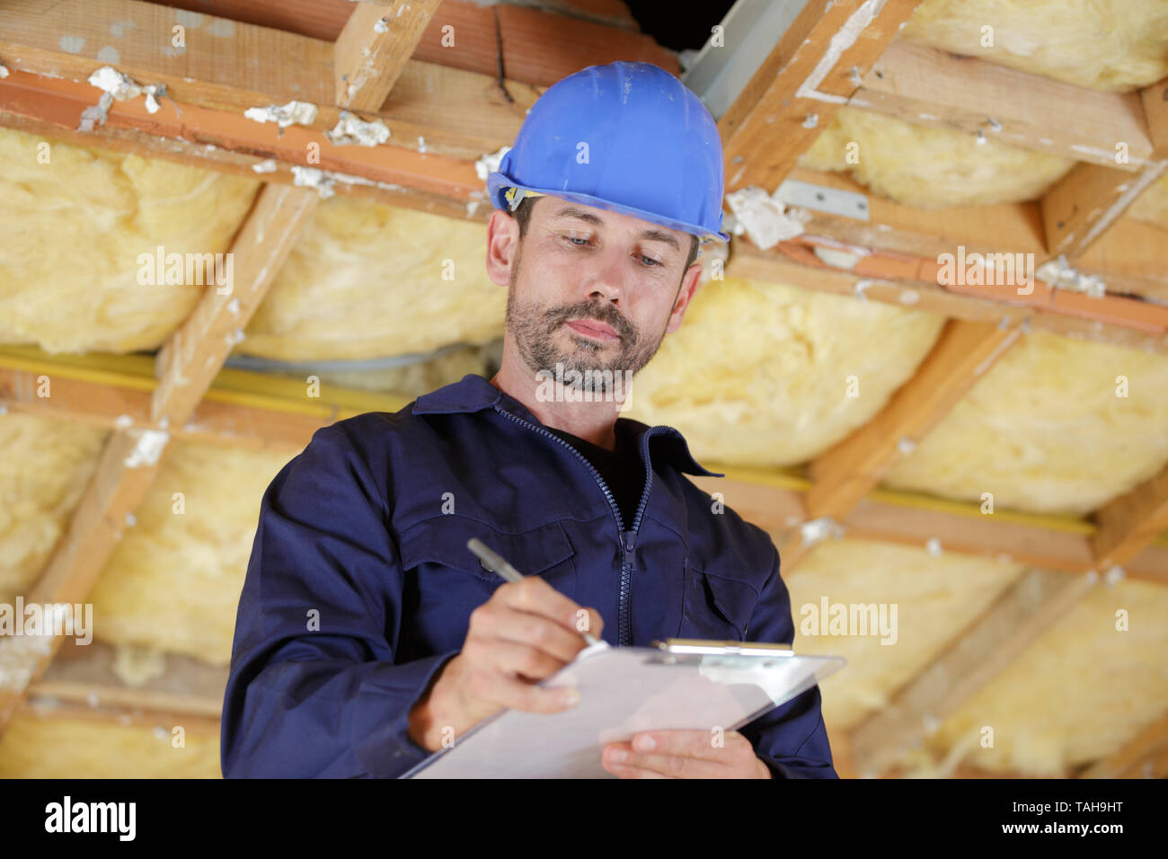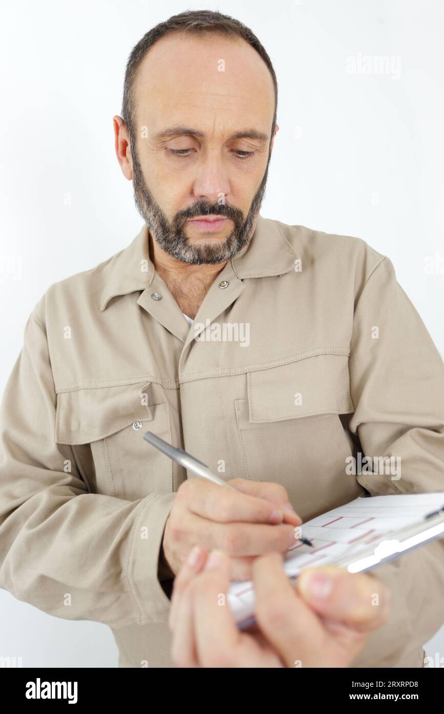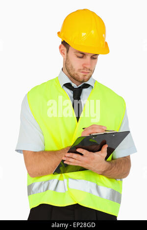Young foreman taking note on clipboard Stock Photo - Alamy