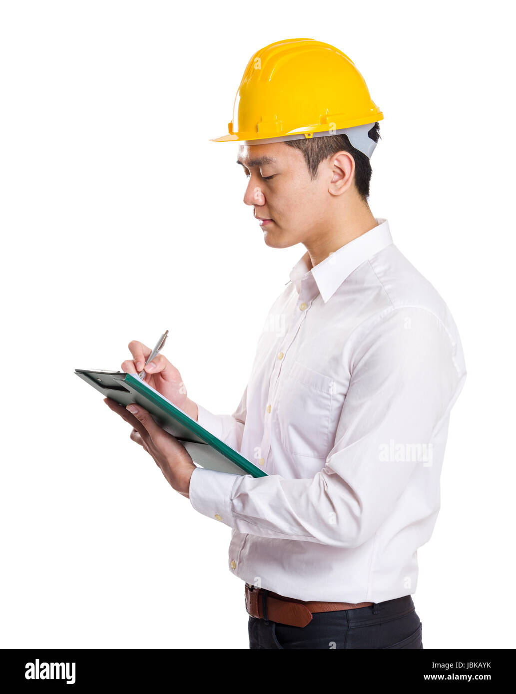 Young foreman taking notes on his clipboard Stock Photo - Alamy