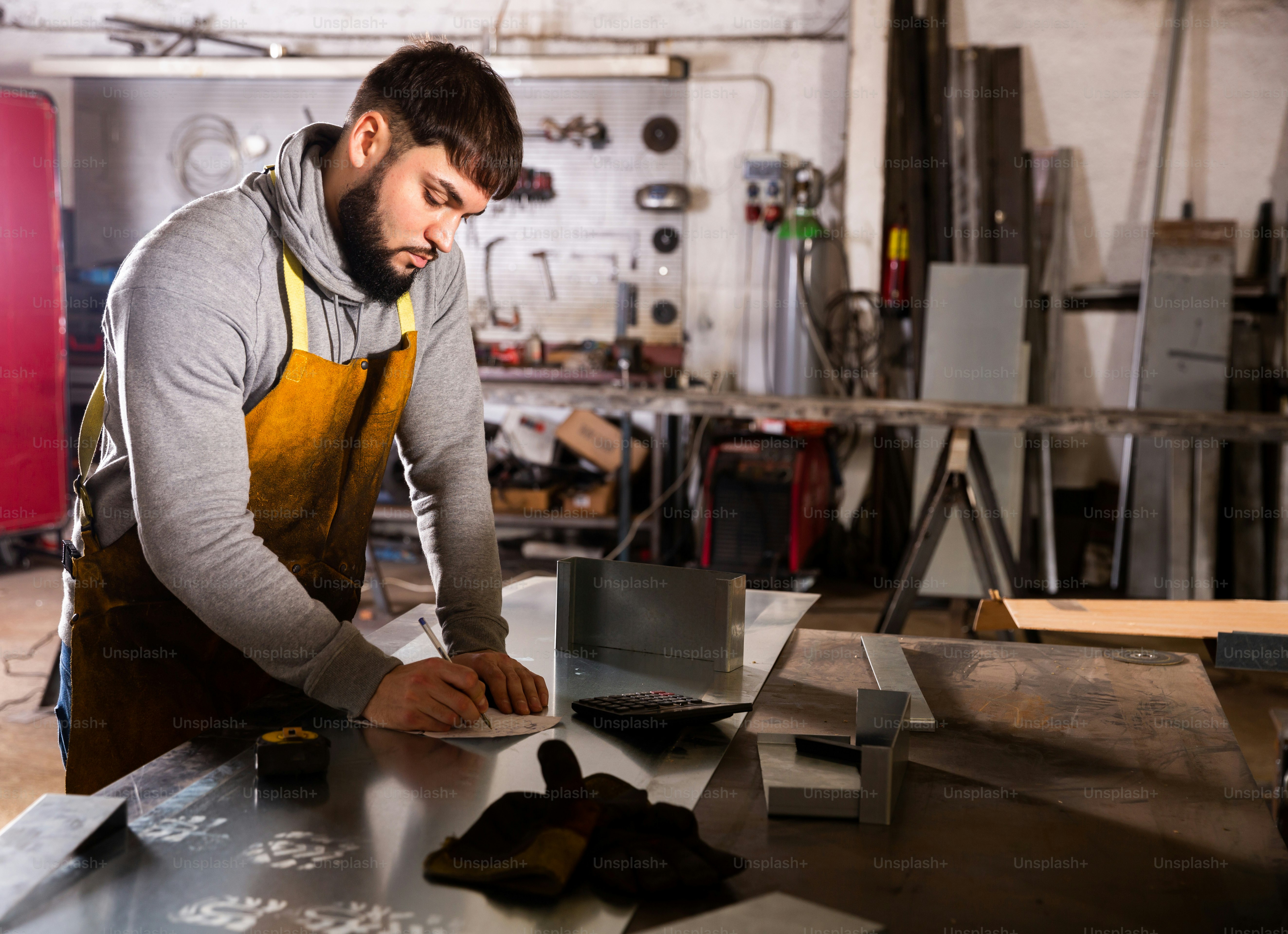 Foreman measures part and takes notes on paper photo – Factory Image on ...