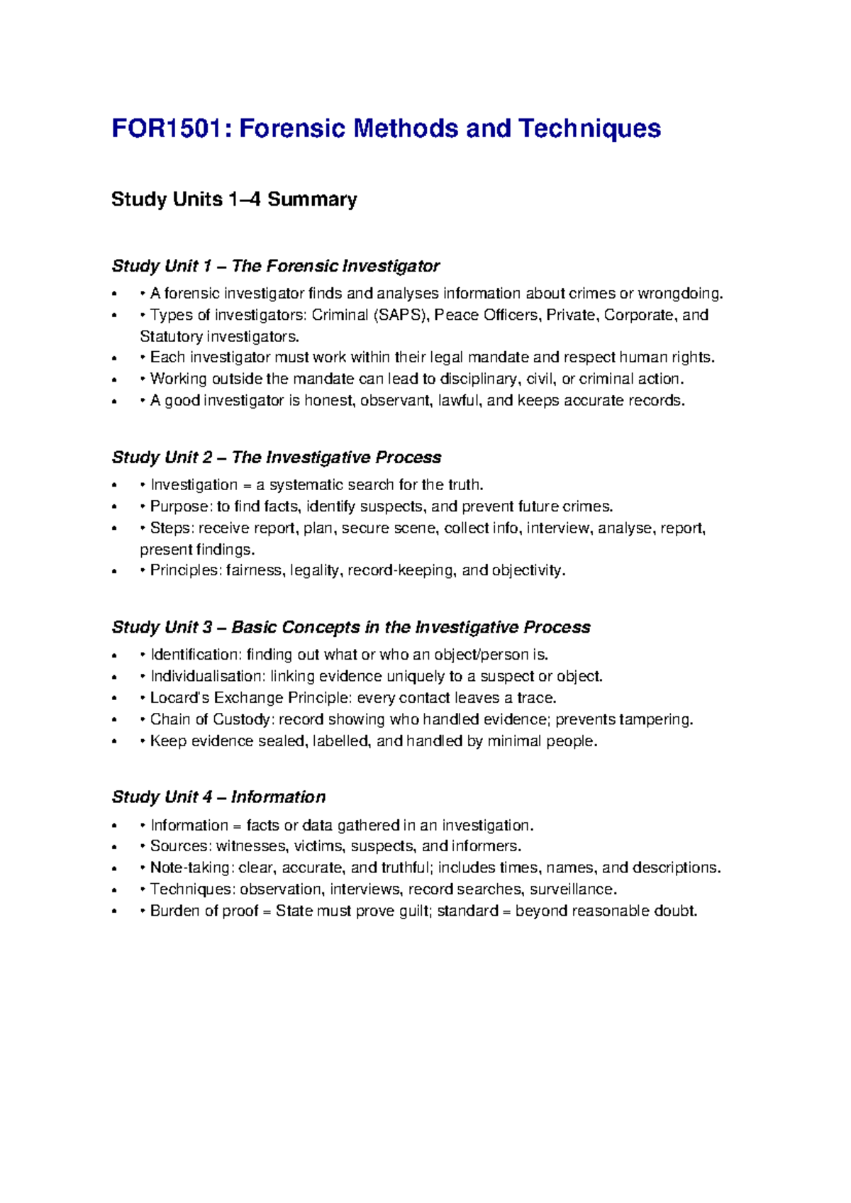 FOR1501: Forensic Methods & Techniques Study Notes Part 1 - Studocu