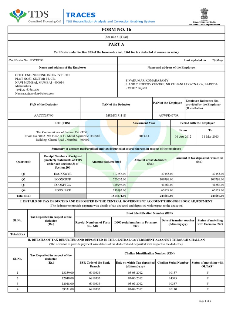 Form 16 PDF Download - Income Tax Department