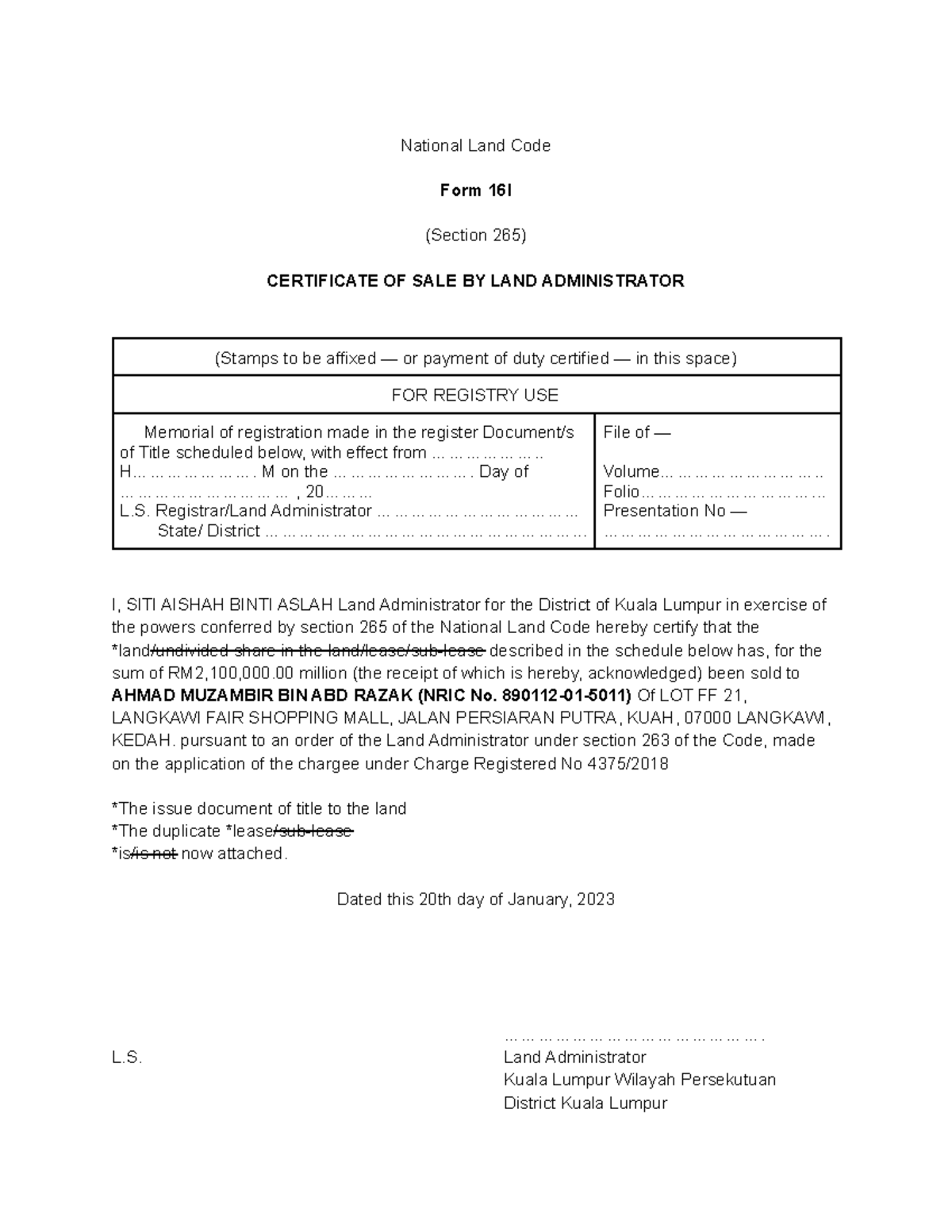 Form 16i - Note - National Land Code Form 16I (Section 265) CERTIFICATE ...