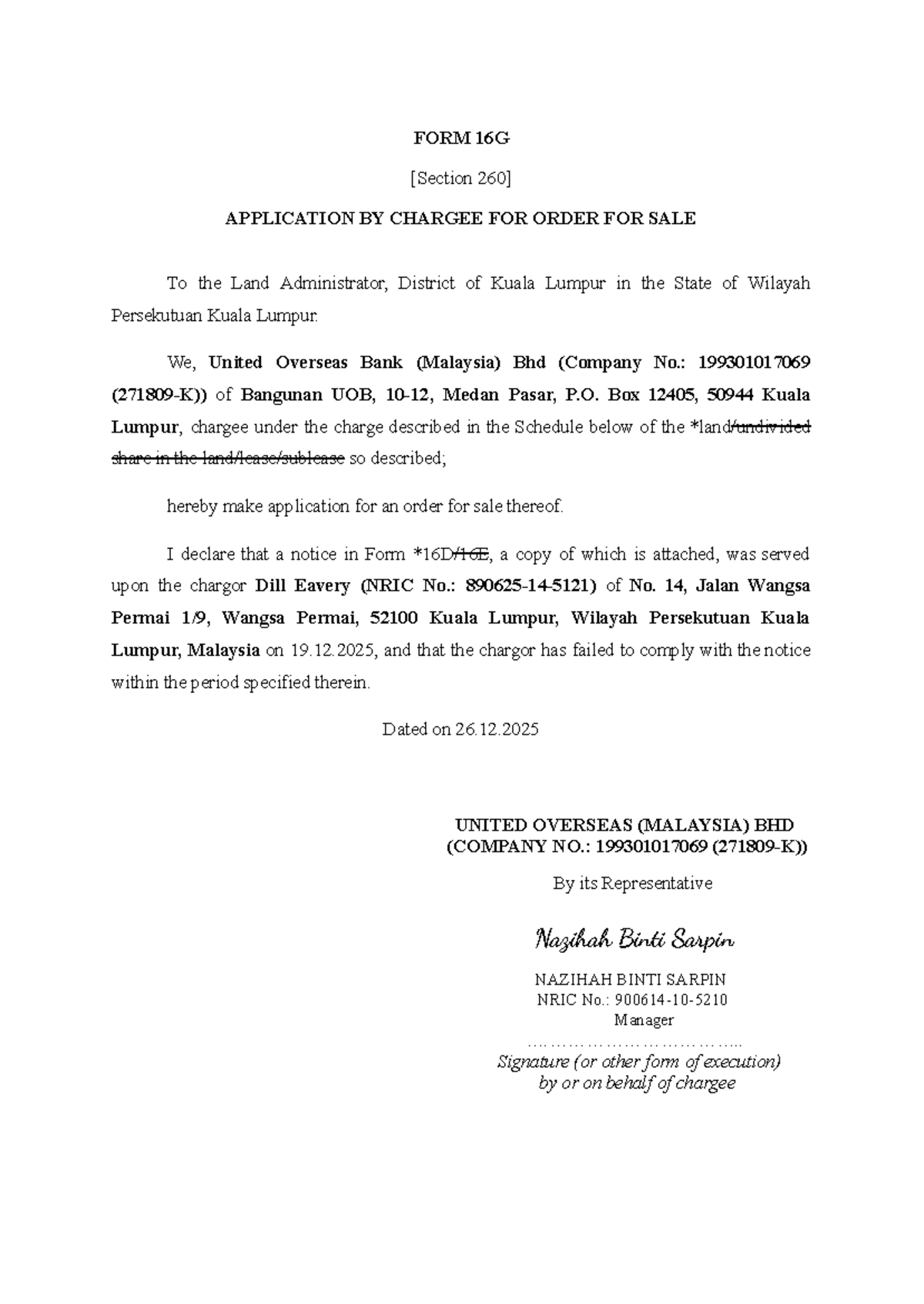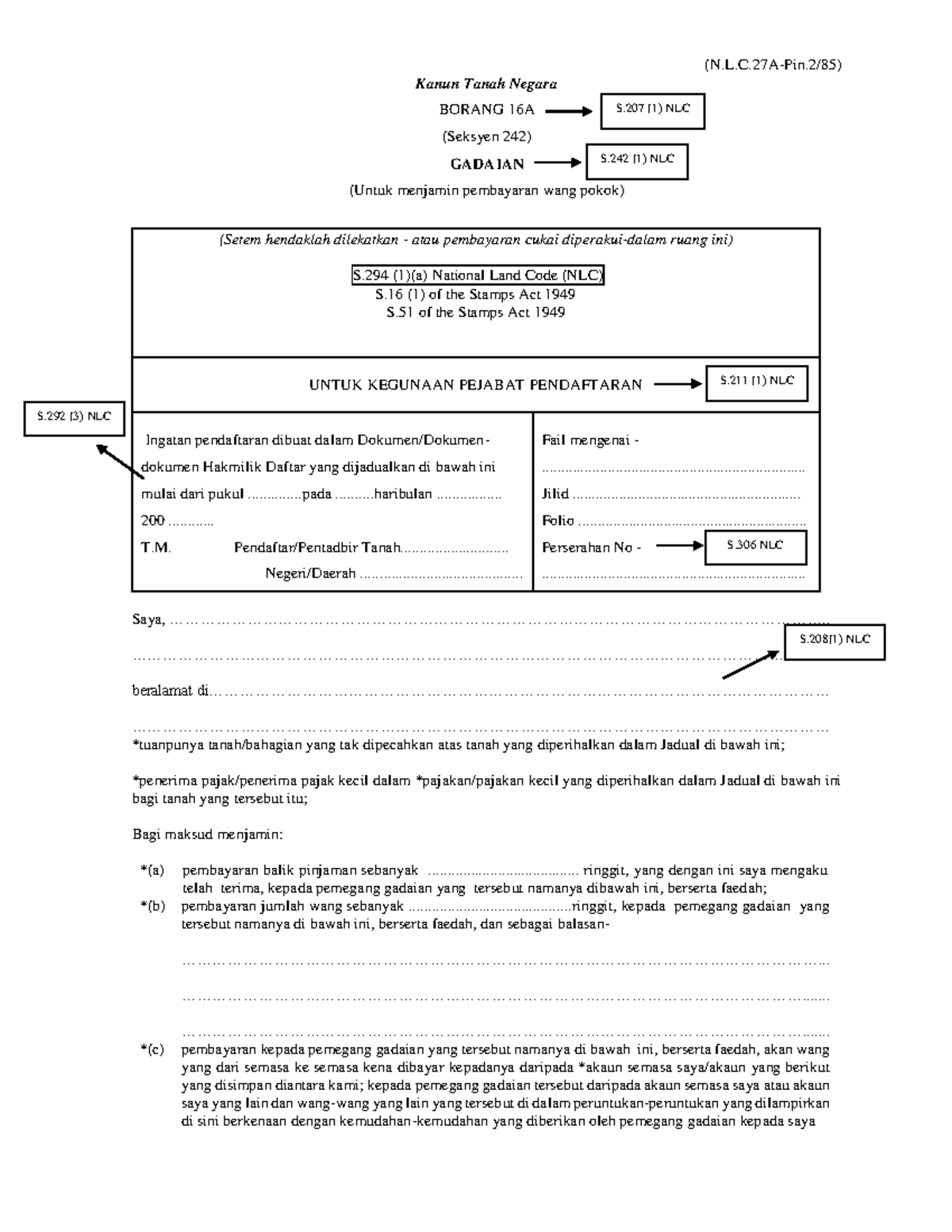 Form 16A (Charge form) NLC of Malaysia - (N.L. 27A-Pin. 2/85) Kanun ...