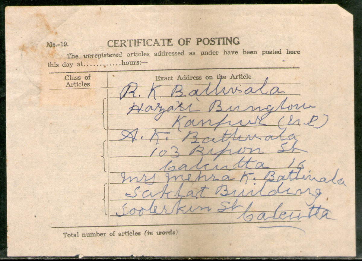 India 1960 Grant Road Bombay tied Certificate of Posting form # 7635 ...
