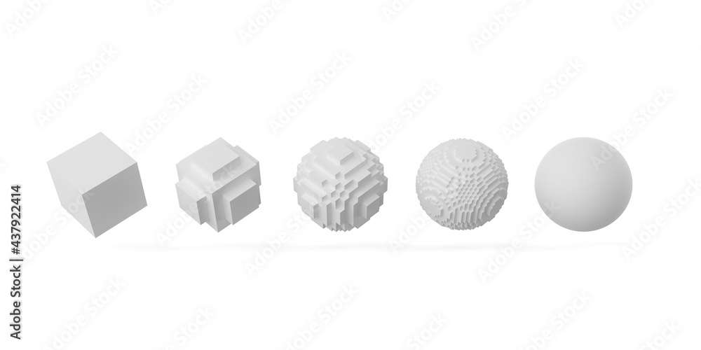 Evolving sequence from pixelized cubes to sphere over white background ...