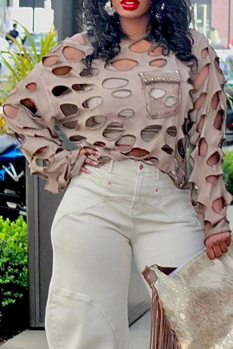 Plus Size Daily Casual Brown Long Sleeve Cut Out Blouses [Pre-Order ...
