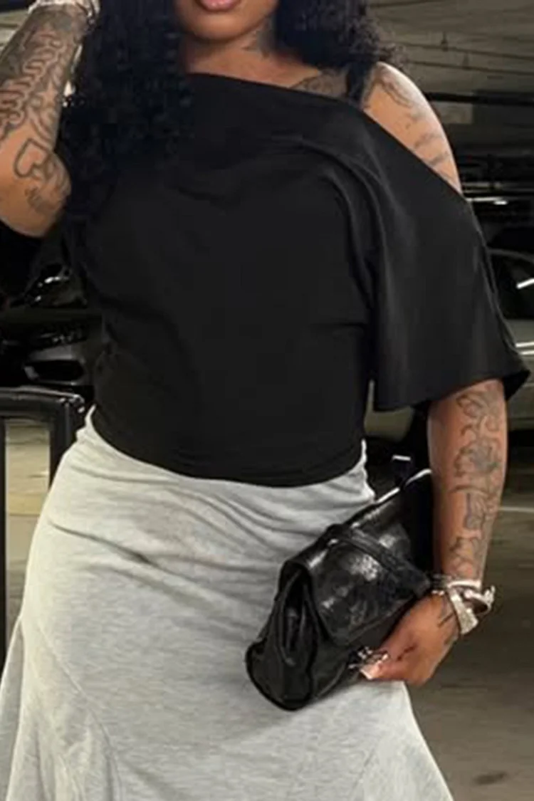 Plus Size Daily Casual Black Oblique Collar Short Sleeve T-Shirts [Pre ...