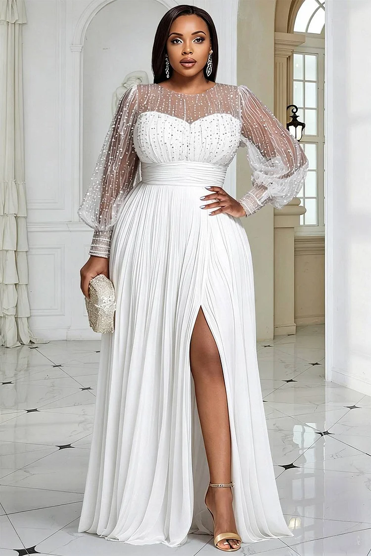 Xpluswear Design Plus Size Formal White Round Neck Long Sleeve Split ...