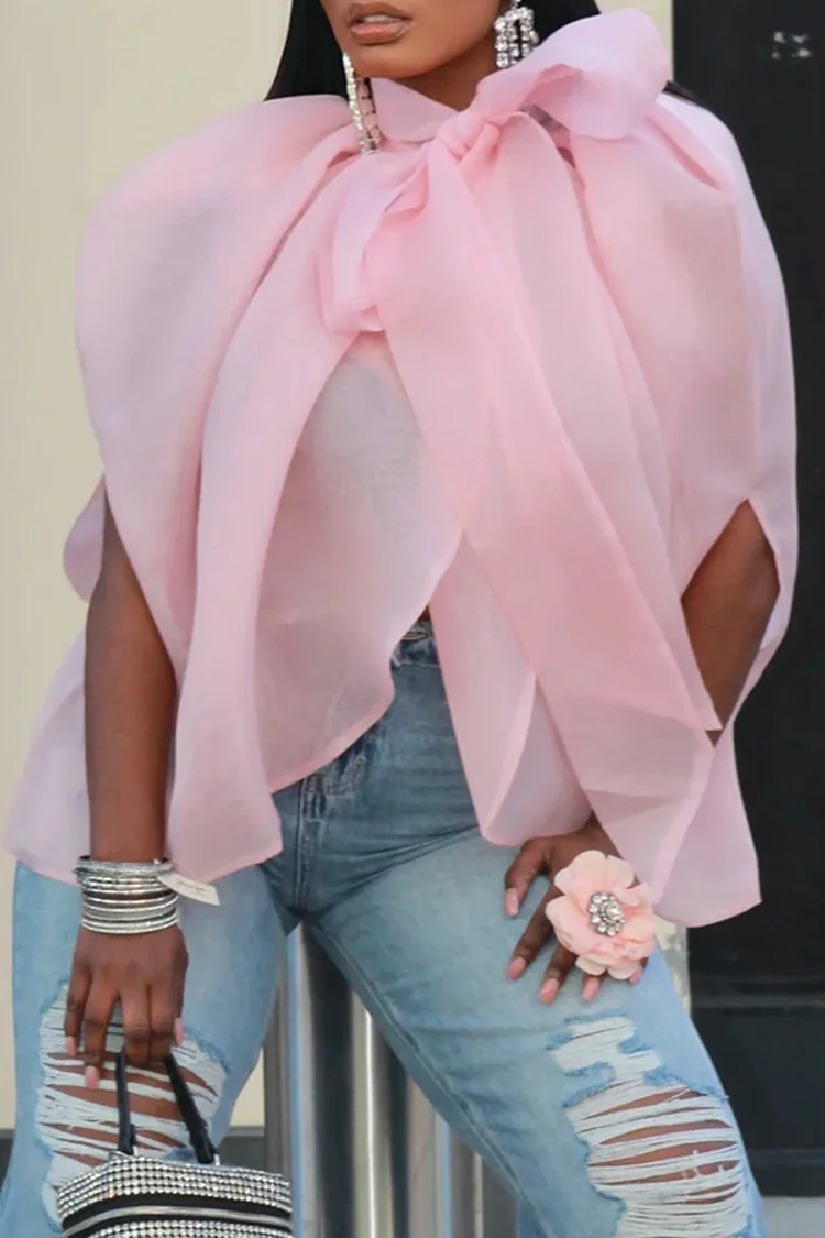 Plus Size Daily Casual Pink Mock Neck Short Sleeve Bow Tie Organza ...