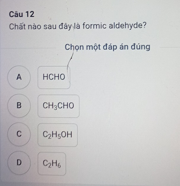 Giải quyết:Chất nào sau đây là formic aldehyde? Chọn một đáp án đúng A ...