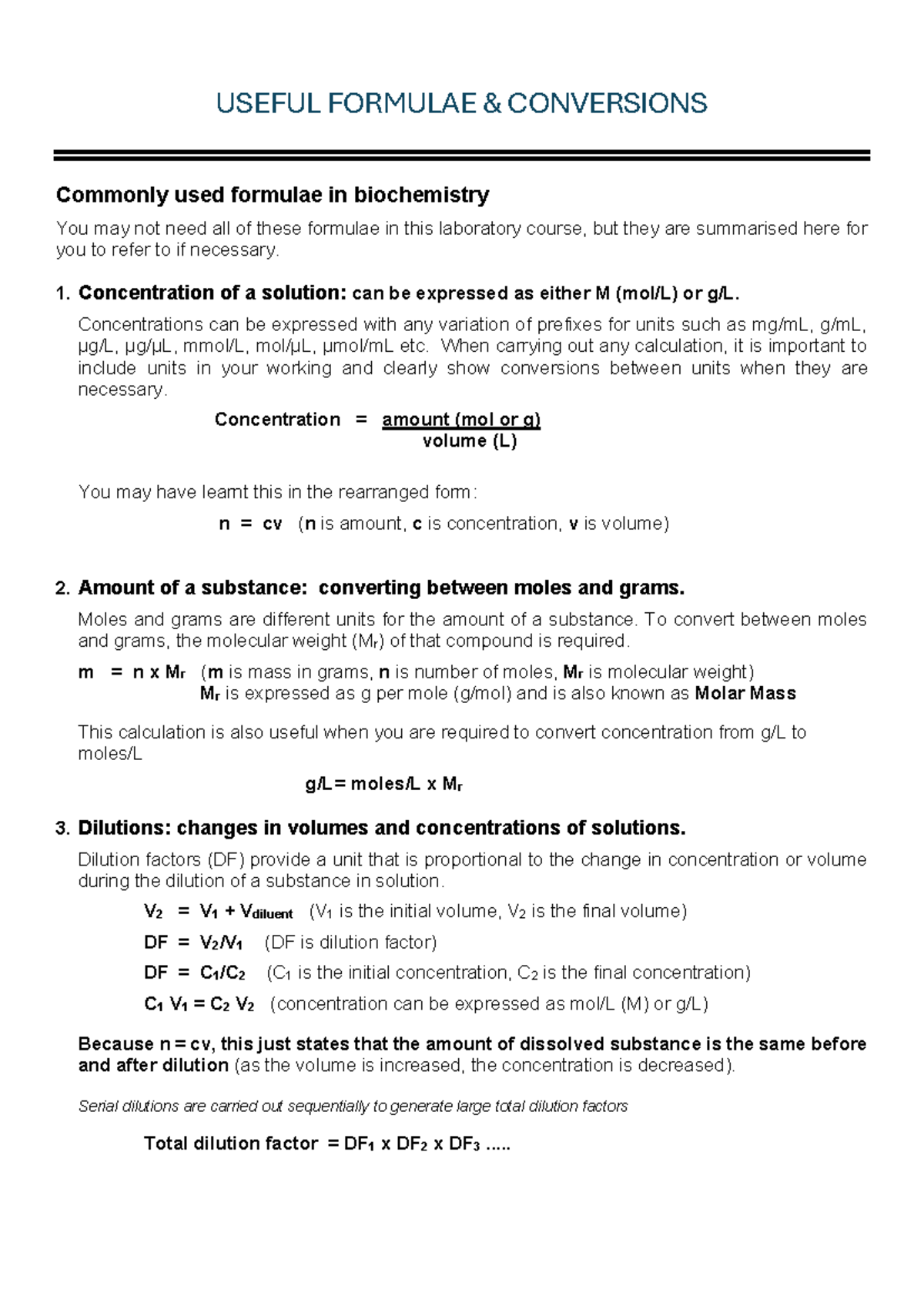 Useful Formulae & Conversions in Biochemistry AHS - Studocu