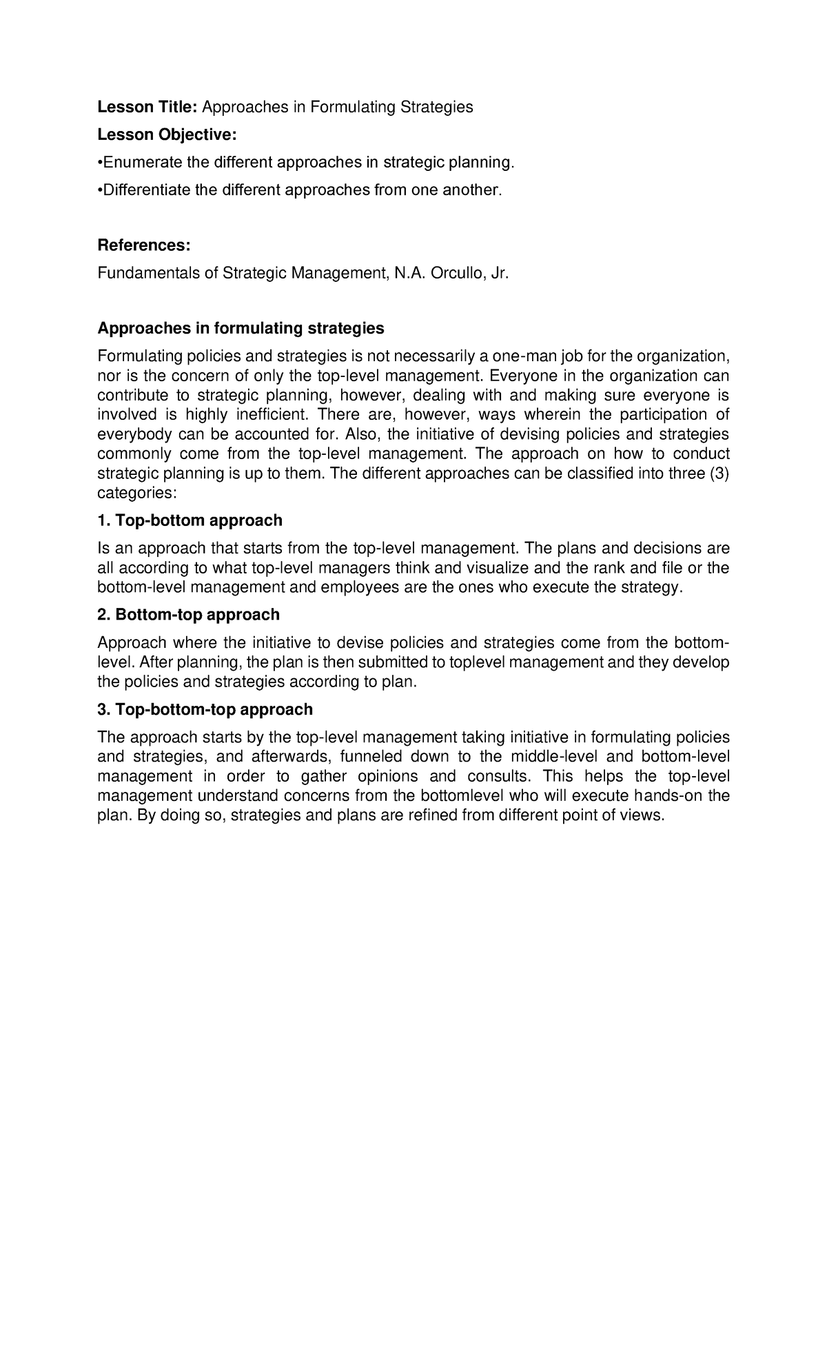 Approaches in Formulating Strategies - •Differentiate the different ...