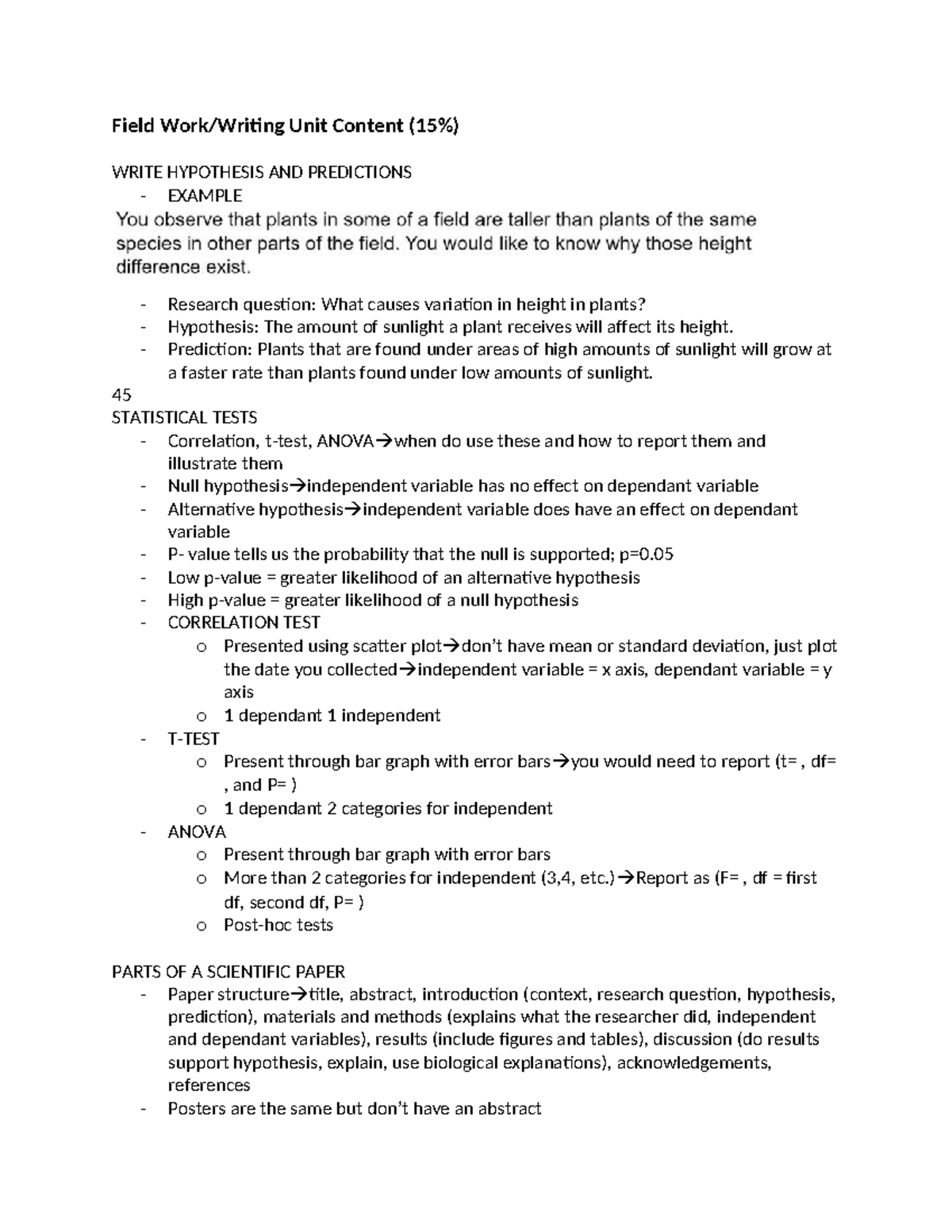 Final Exam Notes: Field Unit Content & Hypothesis Examples - Studocu