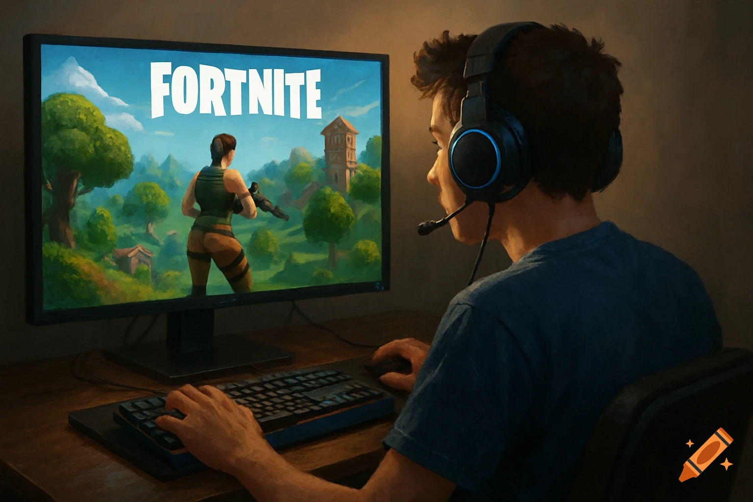 A person wearing headphones plays Fortnite on a computer. on Craiyon