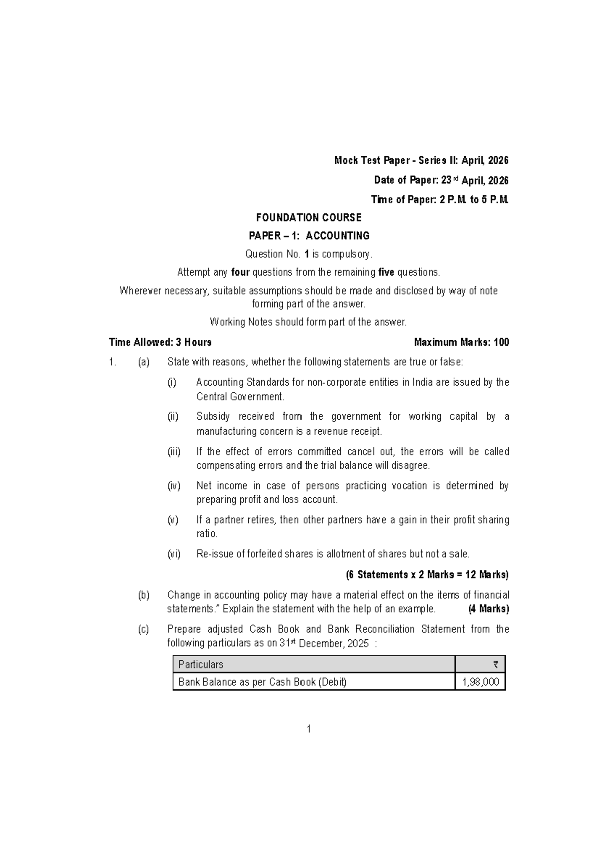 Mock Test Paper Series II: Foundation Course Paper 1 - Accounting - Studocu