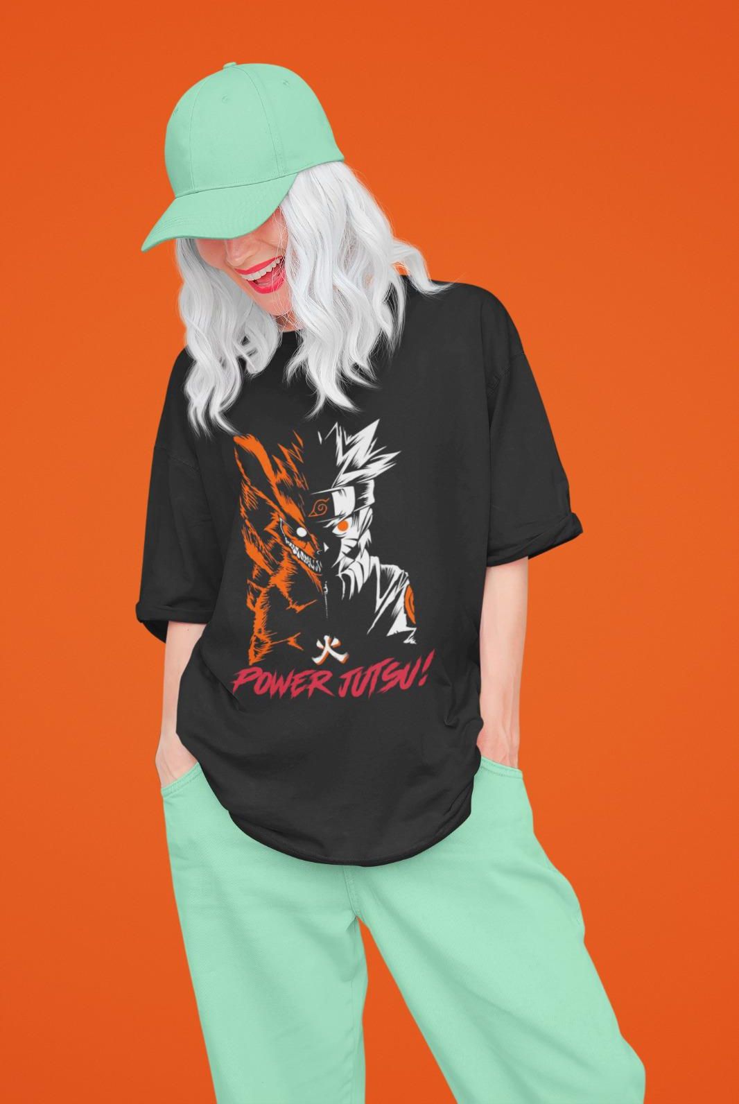 Koszulka damska oversize z bawełny organicznej Naruto Power Jutsu Fox ...