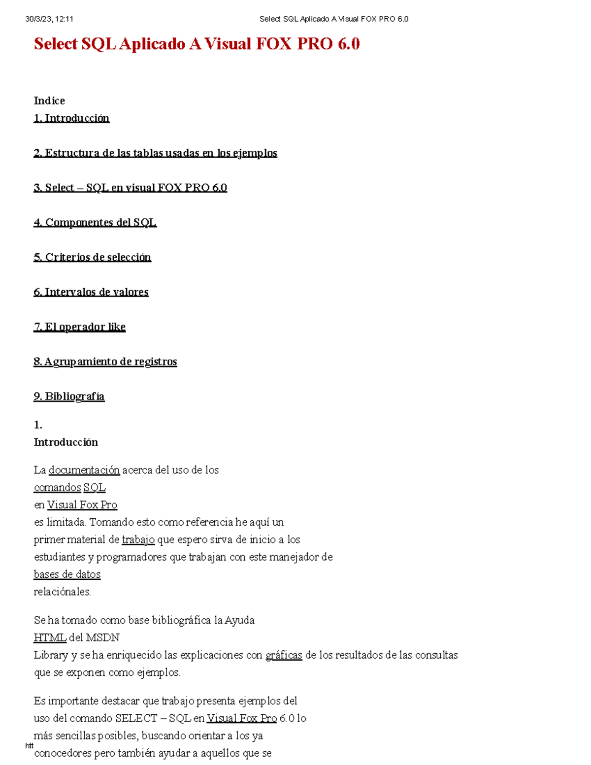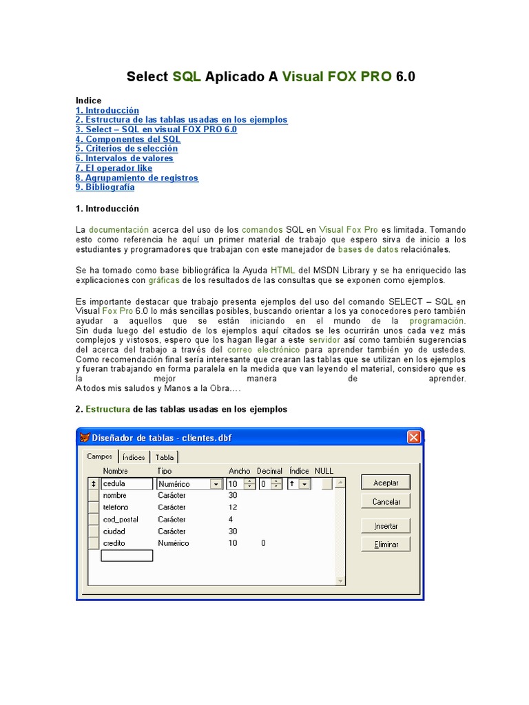 Select SQL Aplicado A Visual FOX PRO 6 - Indice Introducción Estructura ...