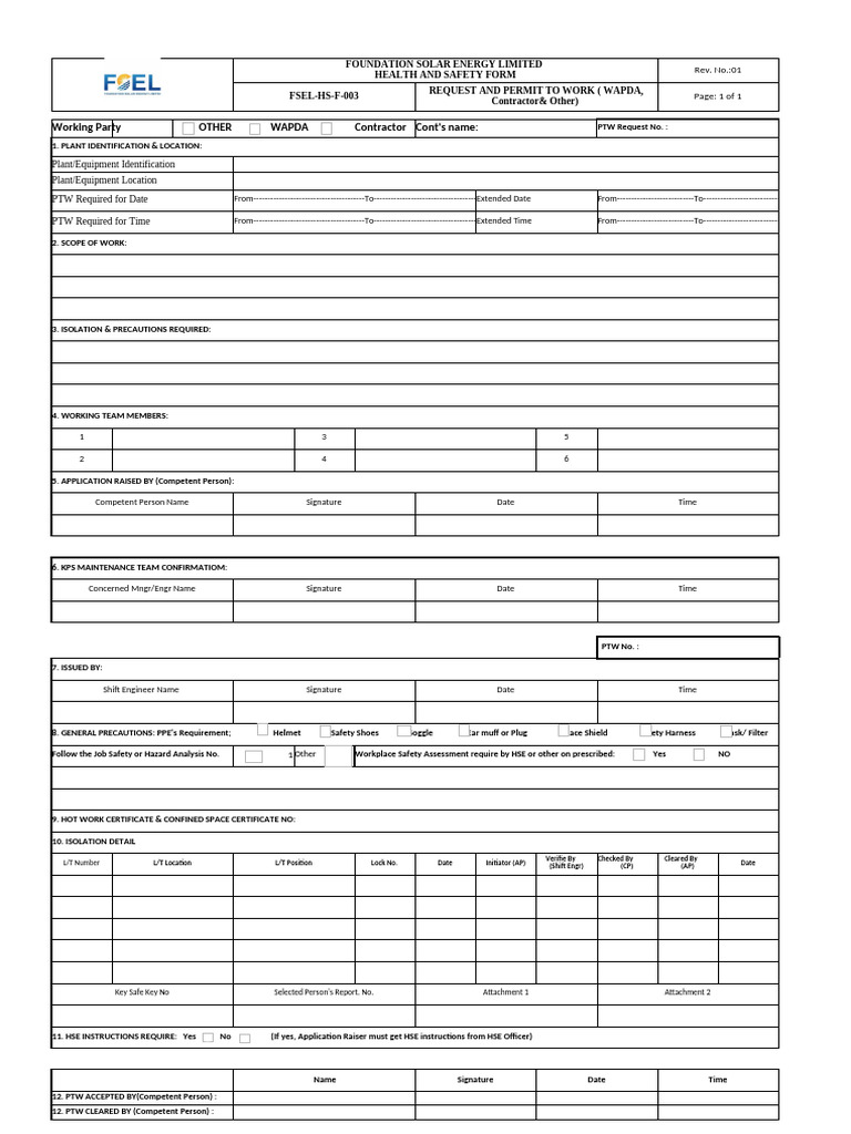 FPCDL Permit to Work Request Form | PDF | Safety | Occupational Safety ...