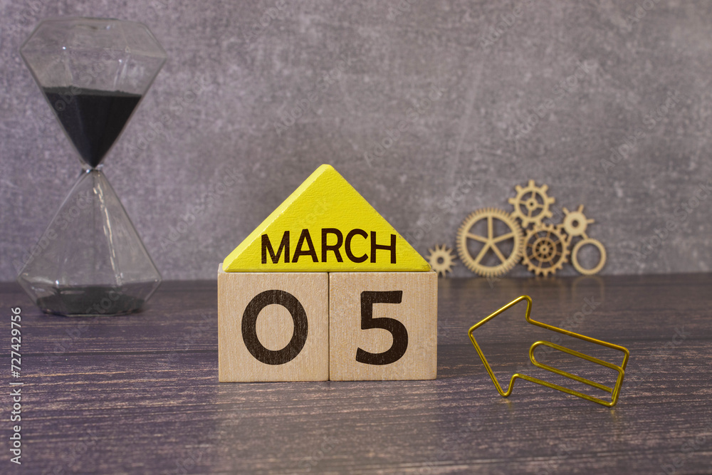 Vintage photo, March 5th. Date of 5 March on wooden cube calendar, copy ...