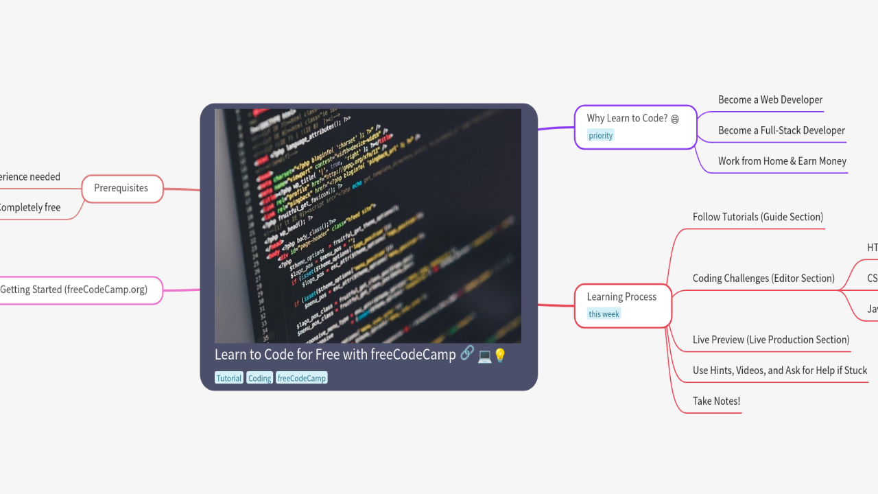 Learn to Code for Free with freeCodeCamp Mind Map