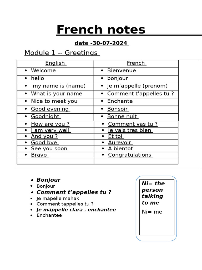 French 101 - Beginner's Level - Note 2 | PDF