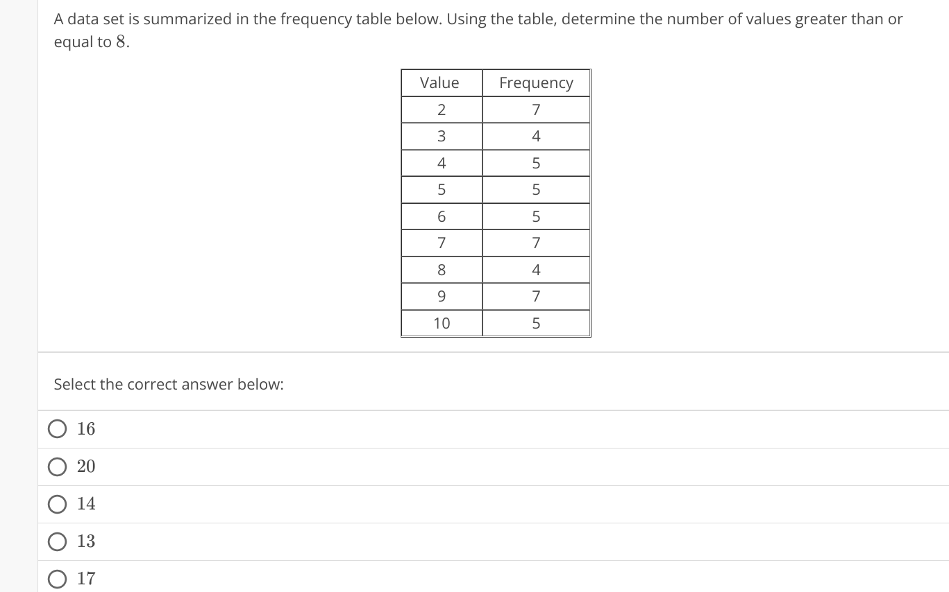 SOLVED: A data set is summarized in the frequency table below. The data ...
