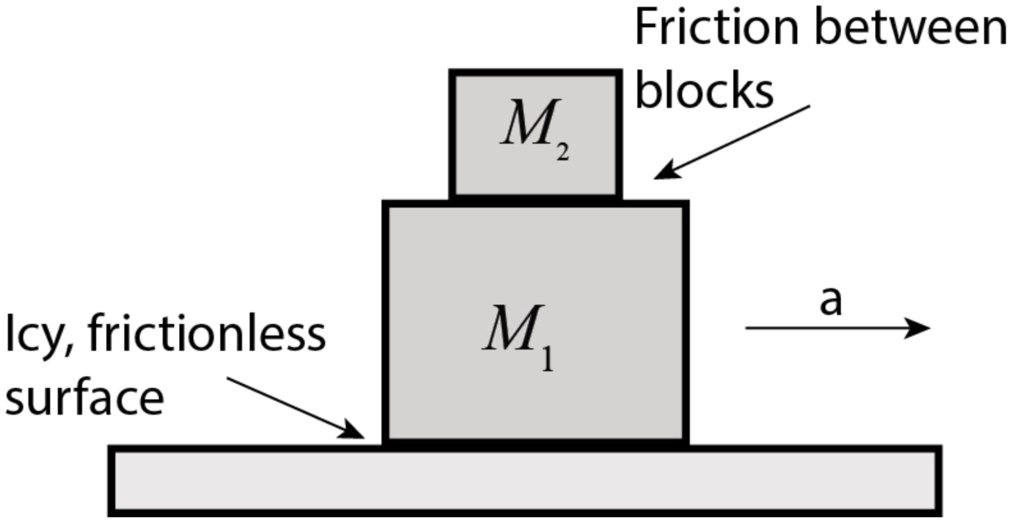 Friction between blocks M2 M1 Icy, frictionless surface a