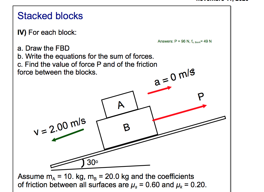 Solved Stacked blocks IV) For each block: Answers: P = 96 N, | Chegg.com