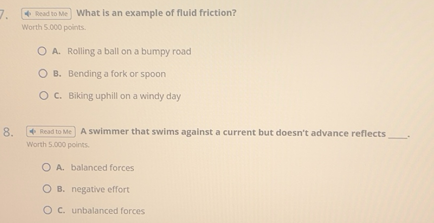 Solved: Read to Me What is an example of fluid friction? Worth 5.000 ...
