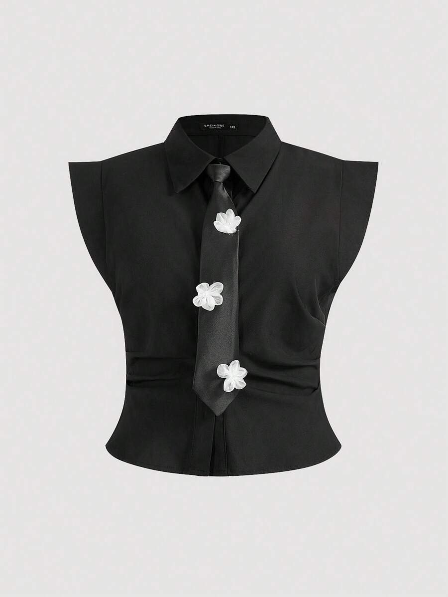 SHEIN MOD Plus Size Ladies' Black Shirt With Necktie Decorated Front ...