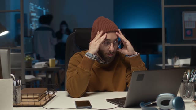 Frustrated software developer working late at night, feeling under ...