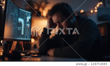 Frustrated programmer in dark room working late...のイラスト素材 [128751693 ...