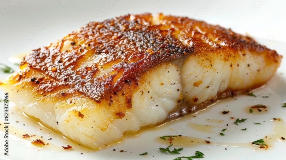 Gourmet Pan-Fried Cod Fillet with Crispy Skin on White Background in ...