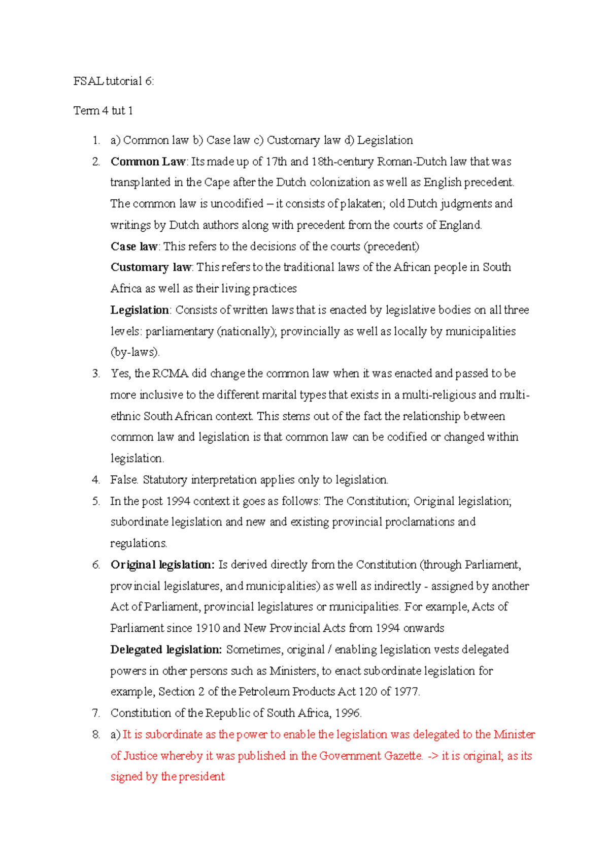 FSAL tutorial 6 - a) Common law b) Case law c) Customary law d ...